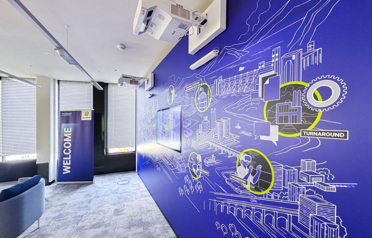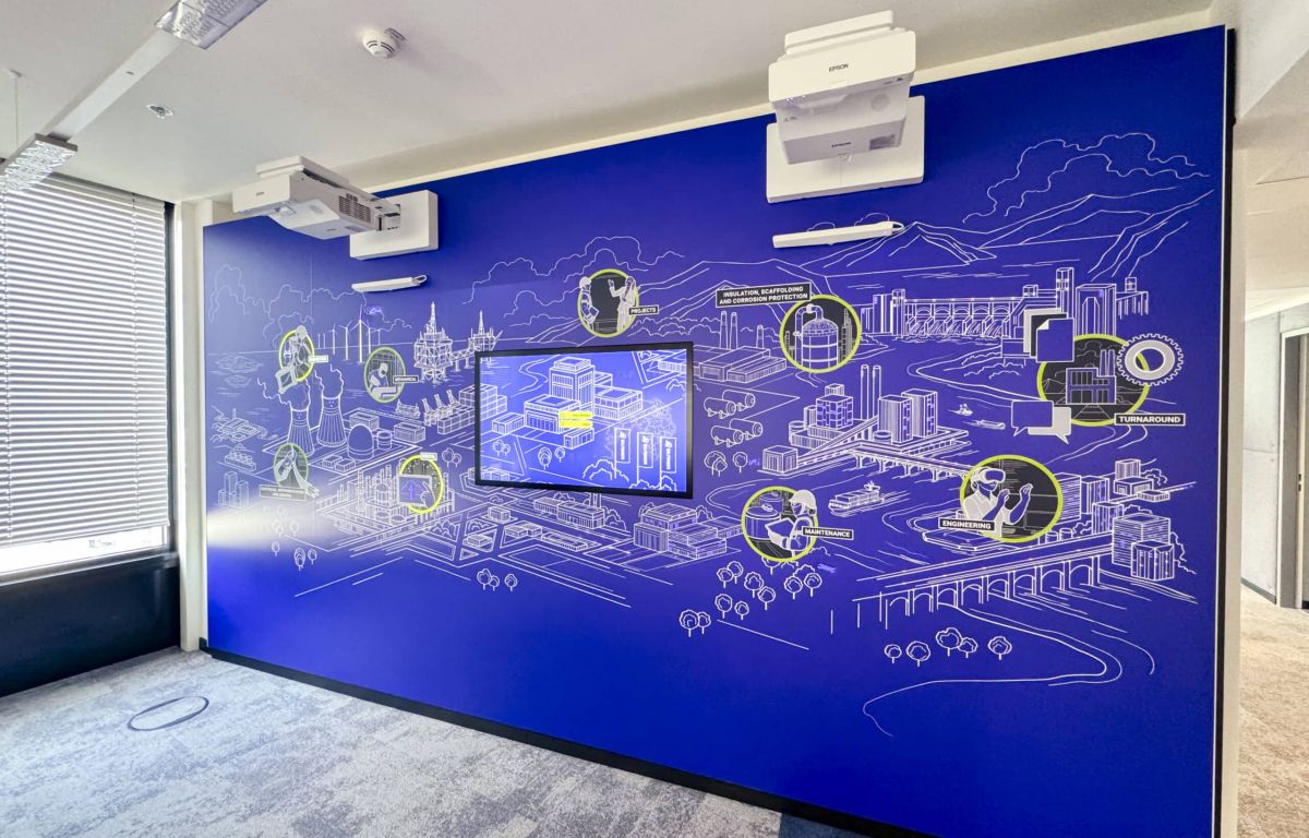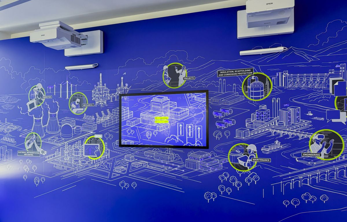 Eine großformatige Medienwand bei Bilfinger SE verbindet Projektion, Touchscreen und Sensorik zu einer interaktiven Unternehmenspräsentation, die Besucher*innen aktiv einbezieht und komplexe Inhalte auf anschauliche Weise erlebbar macht.