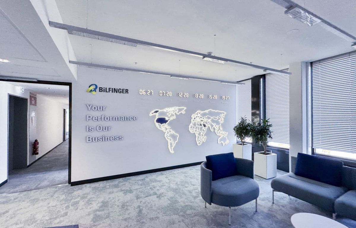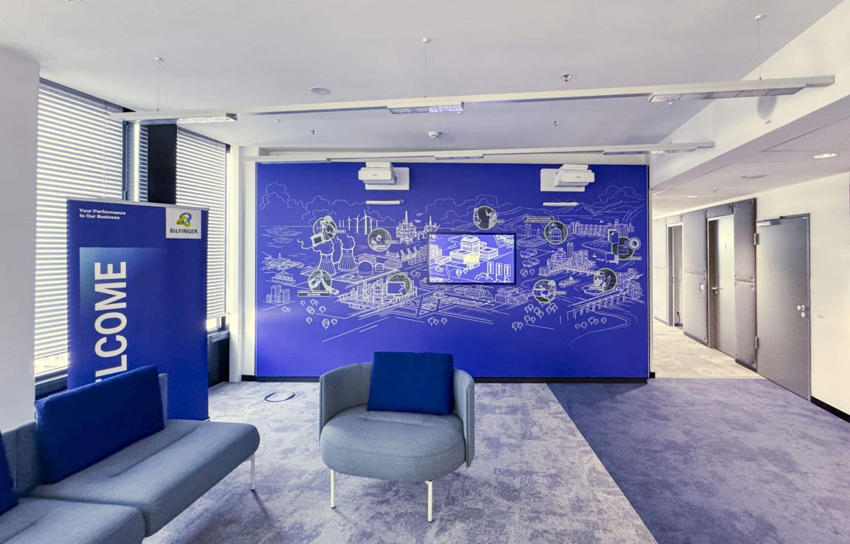 Die Medienwand fügt sich harmonisch in die Architektur der Vorstandsetage ein. Ihr Design folgt der visuellen Sprache von Bilfinger und übersetzt diese in eine räumlich animierte Form. Klare Linien und die präzise Übereinstimmung von Druck und Projektion erzeugen ein ruhiges, dennoch eindrucksvolles Gesamtbild.